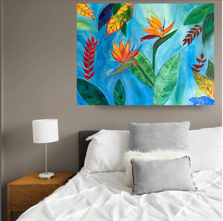 This vibrant piece was born from a time of growth; both in art and in life. I always love painting Bird of Paradise flowers for their bold shape and colors; to me, they represent expression, beauty, sunshine, and a little bit of magic.