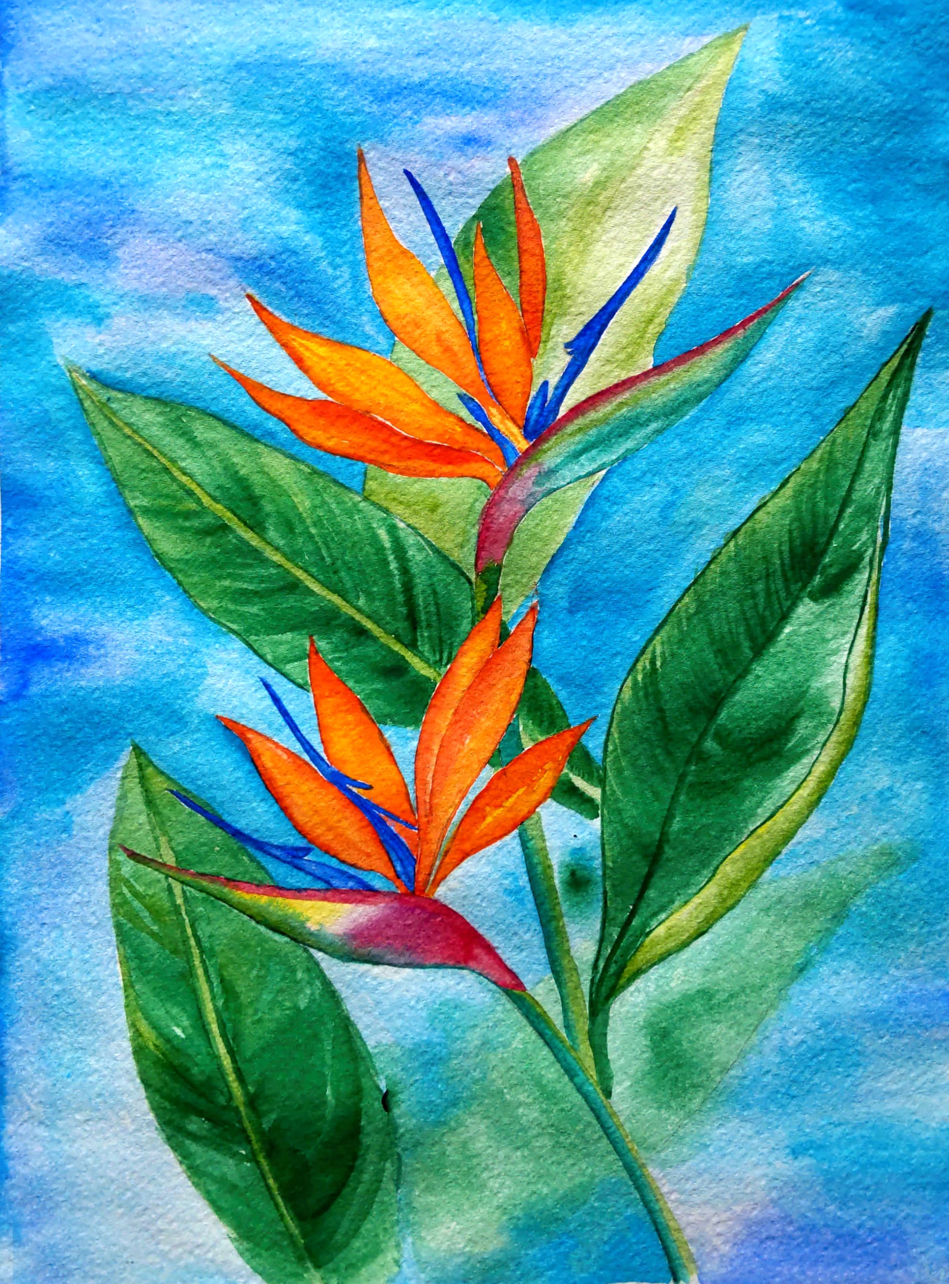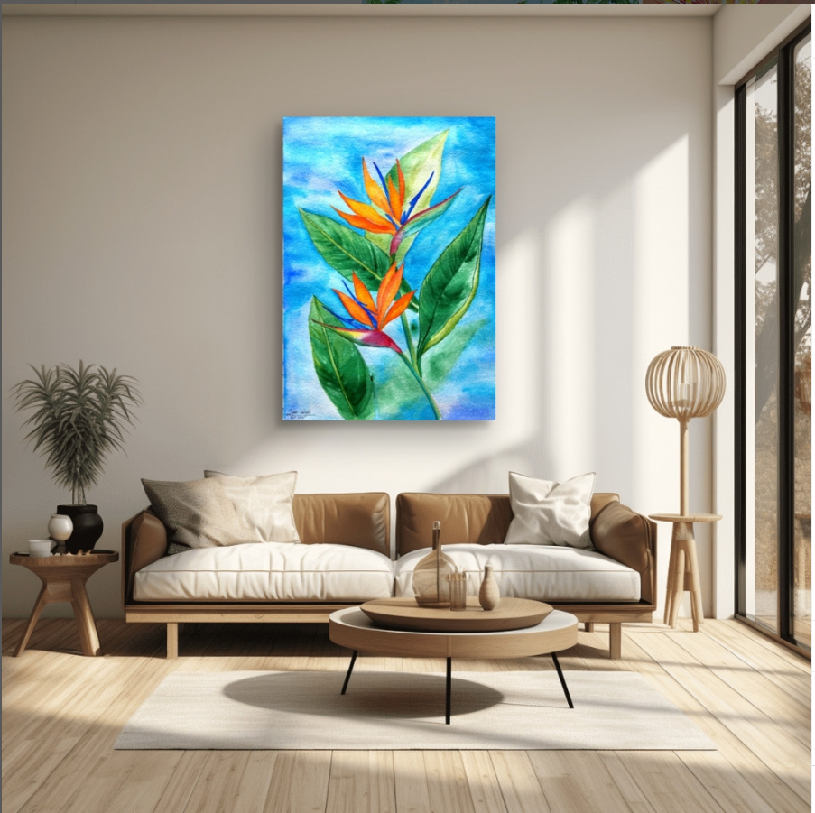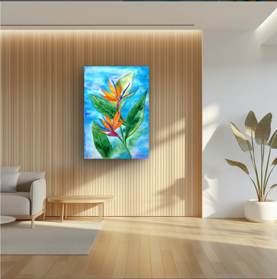 This painting holds a special place in my heart. It features two Bird of Paradise flowers, painted in watercolor on a soft, blended background of pale blue and gentle purple. The colors flow quietly, creating a serene and delicate feeling—calm yet full of vibrant life.