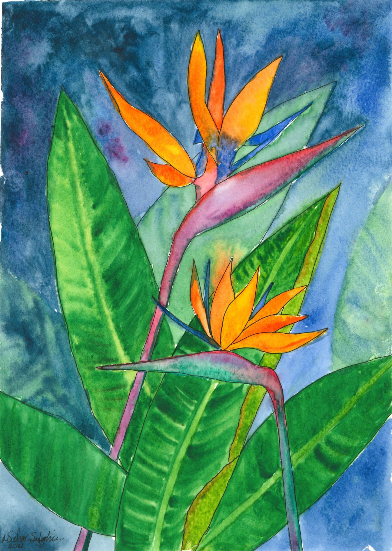 This watercolor painting features two Bird of Paradise flowers set against a deep blue background—a color I rarely use but found perfect for this piece. The Birds of Paradise have always drawn me in with their vibrant colors and expressive shapes, symbolizing sunshine beauty, and the magic of self-expression.